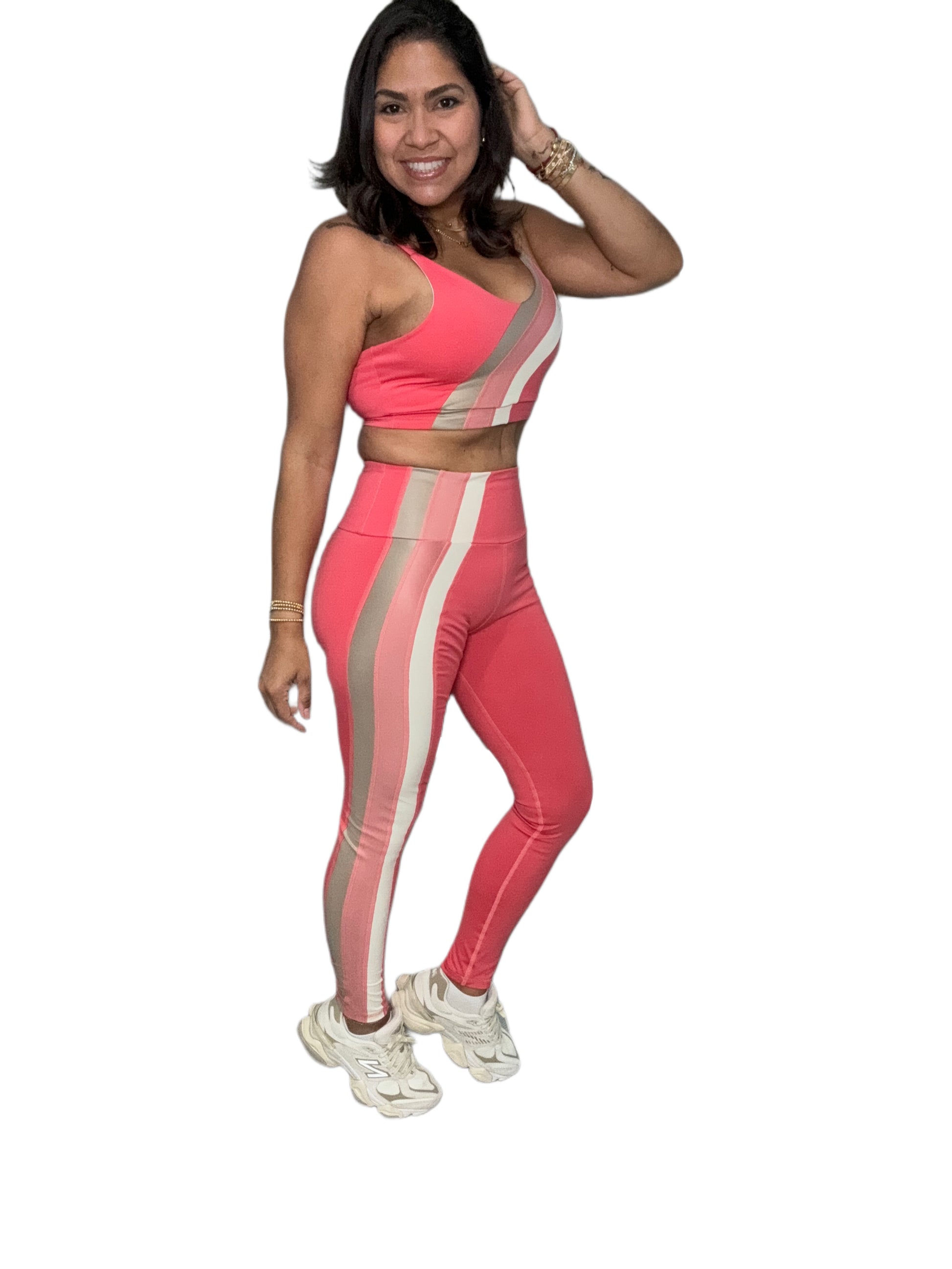 Conjunto de legging más top en tela mate, confeccionados con la más alta tecnología para brindarte comodidad, a la vez que moldea tu figura y oculta defectos. El legging es talle alto, combina tela mate y en una de sus piernas tiene tres líneas en efecto cuero de colores en tendencia que alargan la pierna. El top es tiras ajustables y tiene el diseño de las tres lineas en efecto cuero, para un diseño único y hermoso.